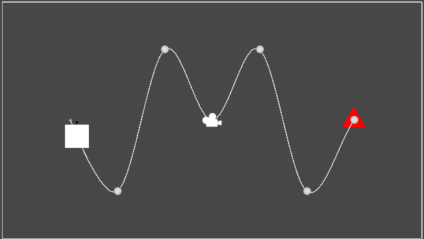 CatmullRom은 각 좌표를 부드러운 직선을 그리며 이동한다. Scene 창에는 다음과 같이 표시된다.